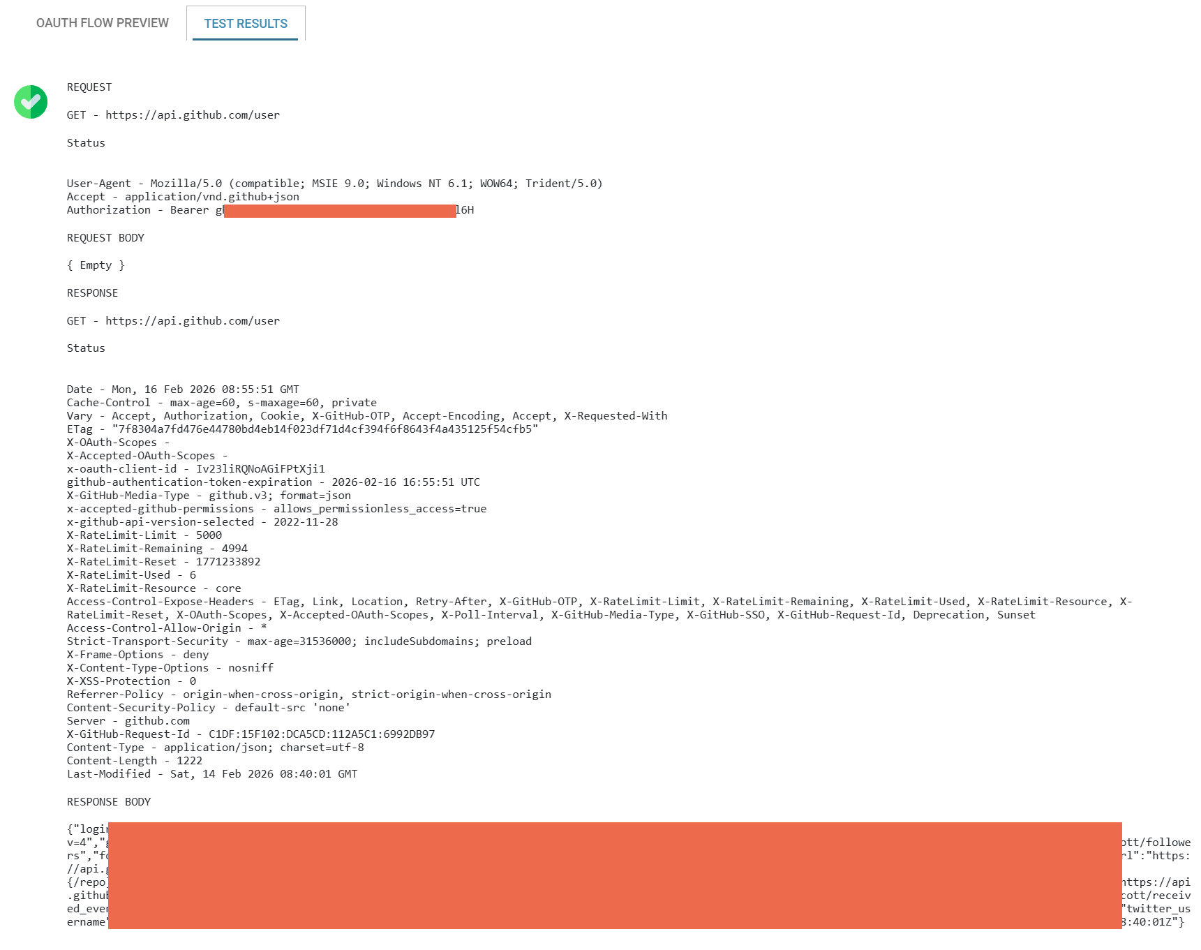 Clicking the test button will execute the OAuth connection and attempt to make a GET request to the Test Url with the returned access token. The test results show :