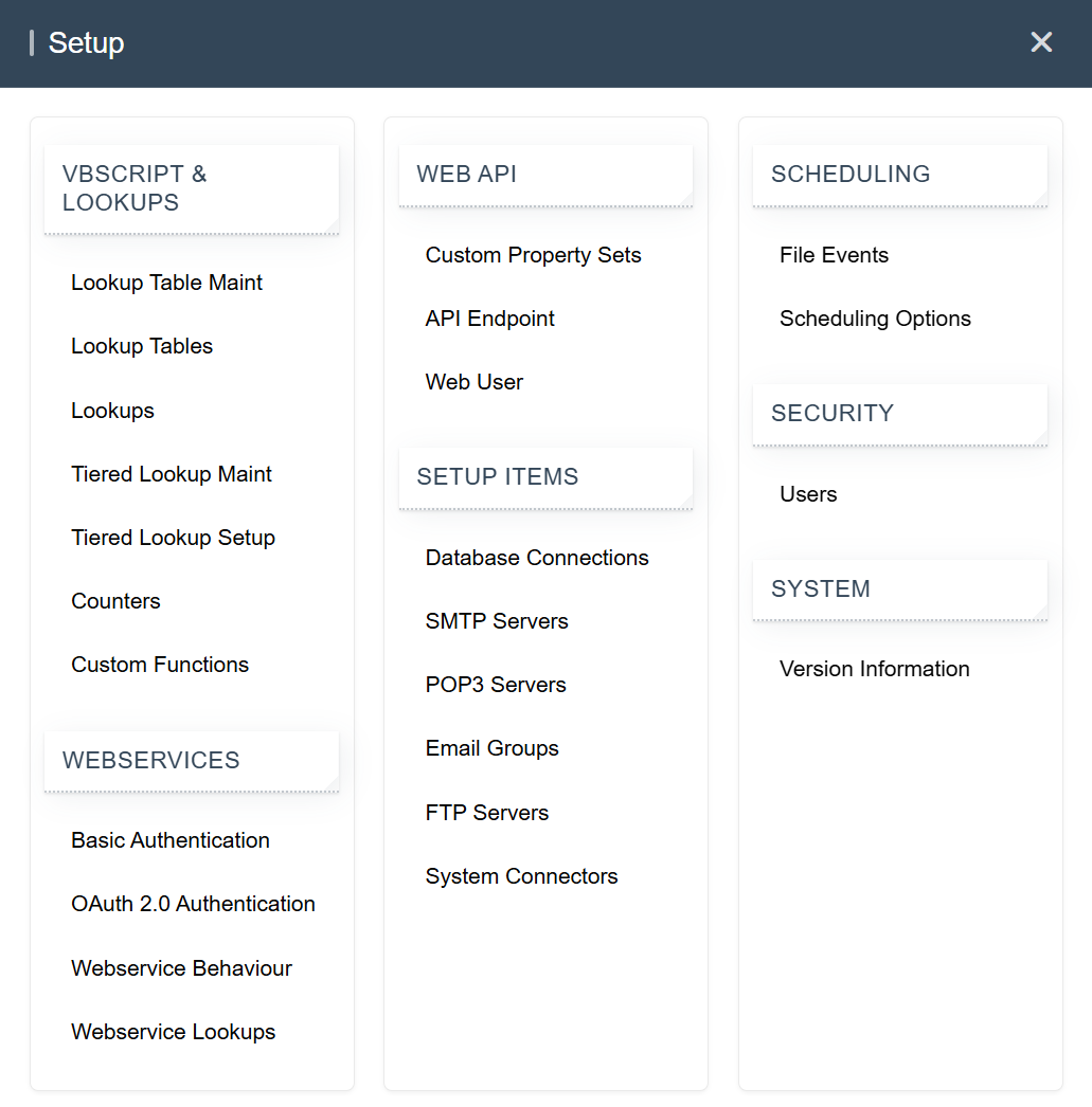 Setup will navigate to the maintenance (addition/editing/deletion) of many of the integration dependencies (Lookups, WebAPI, Database Connections, SMTP Servers, Email Groups, System Connectors, etc).