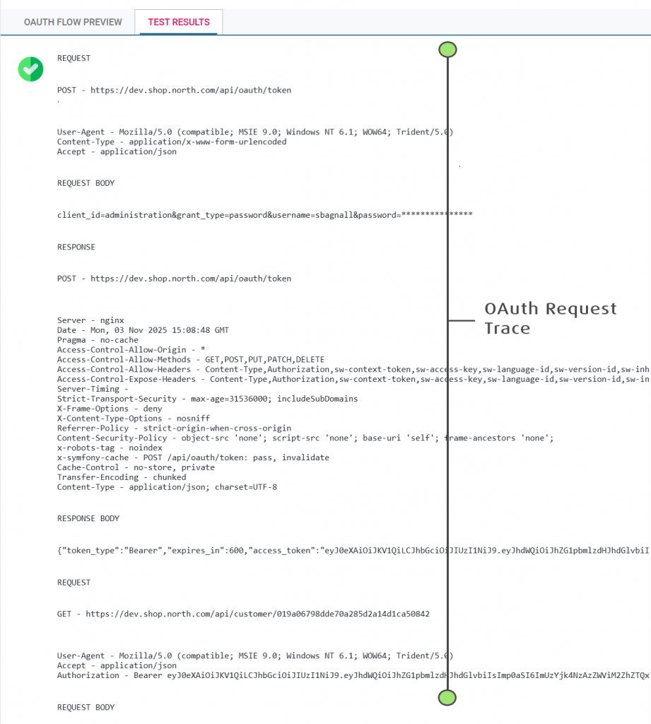 The test function now traces the entire set of OAuth requests; the initial token request, it’s headers and body, the token response and the request to a resource.