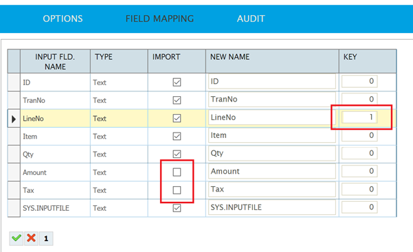 - Deselect the Amount & Tax fields, set the LineNo field to act as the Key.
