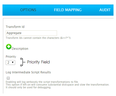 The Priority field is only displayed for transforms where there are 2 or more transforms connected to a parent transform. The priority field is used to control the order of processing.