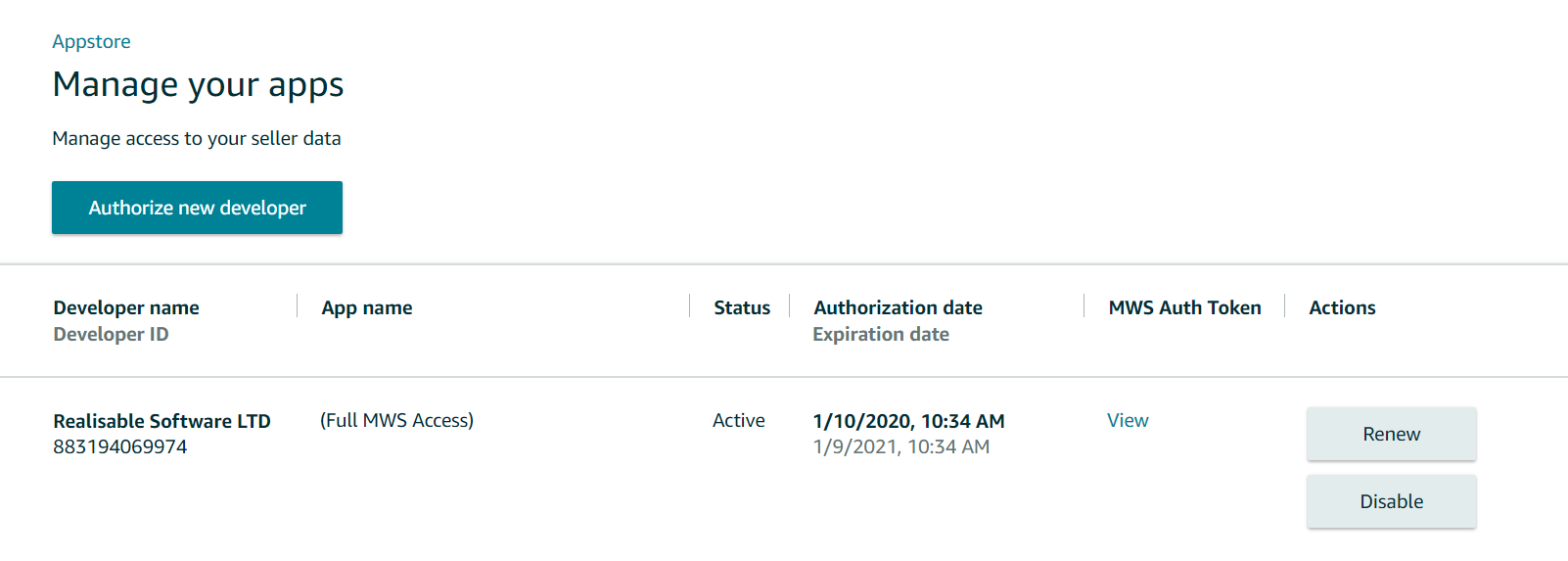 - MWS Authorisation Token