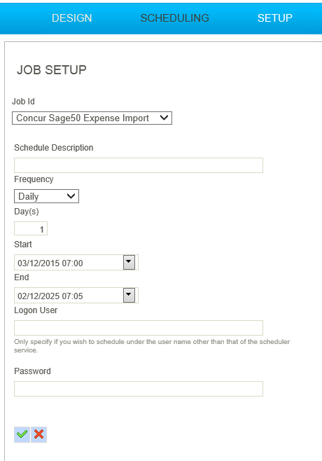 The Concur Expense integration for Sage may be run on-demand or scheduled to run in the background at a specified time.