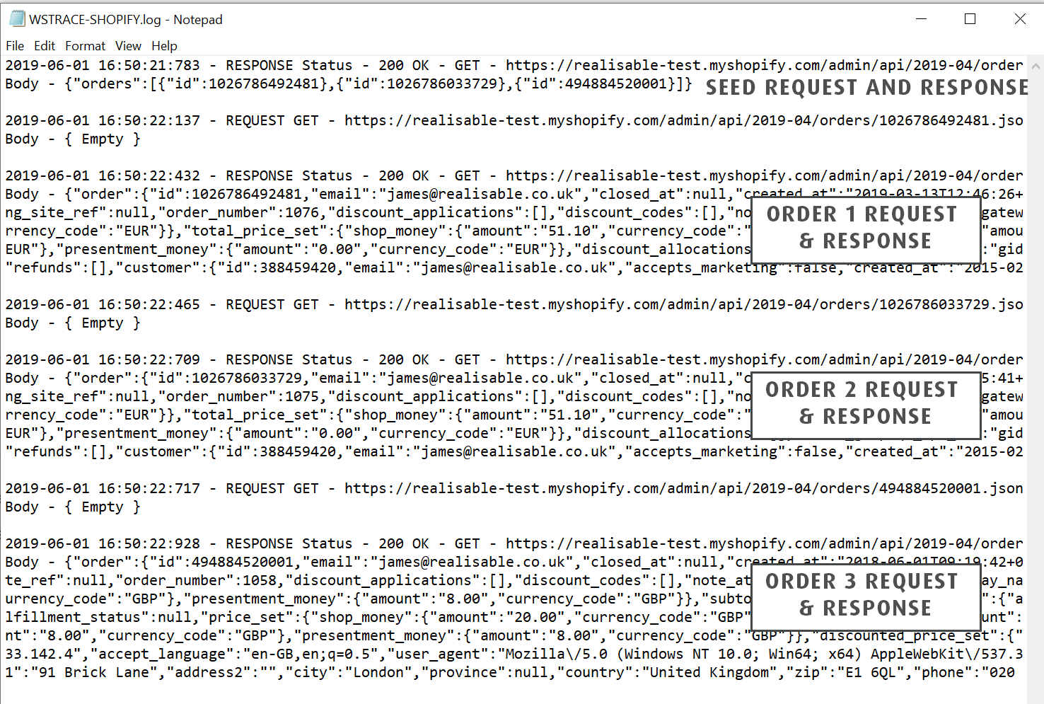 - Again the trace file can be used to verify or check the separate requests being made to Shopify.