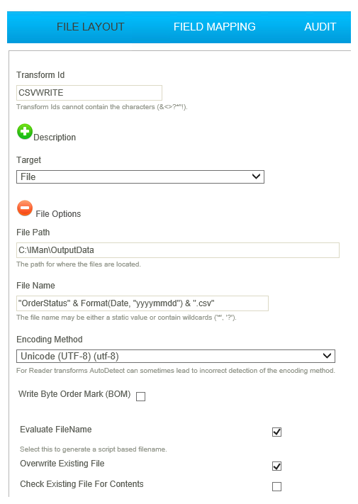 - On the main design screen drag a CSV Writer from the Writers group onto the palette. Connect it to end of the Sage300 Order import and double click to open the setup.