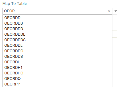 The ‘Map To Table’ text box has been replaced with an auto-complete drop down listing all the tables for the selected database. The following screenshot illustrates the drop-down against the Sage300 database.
