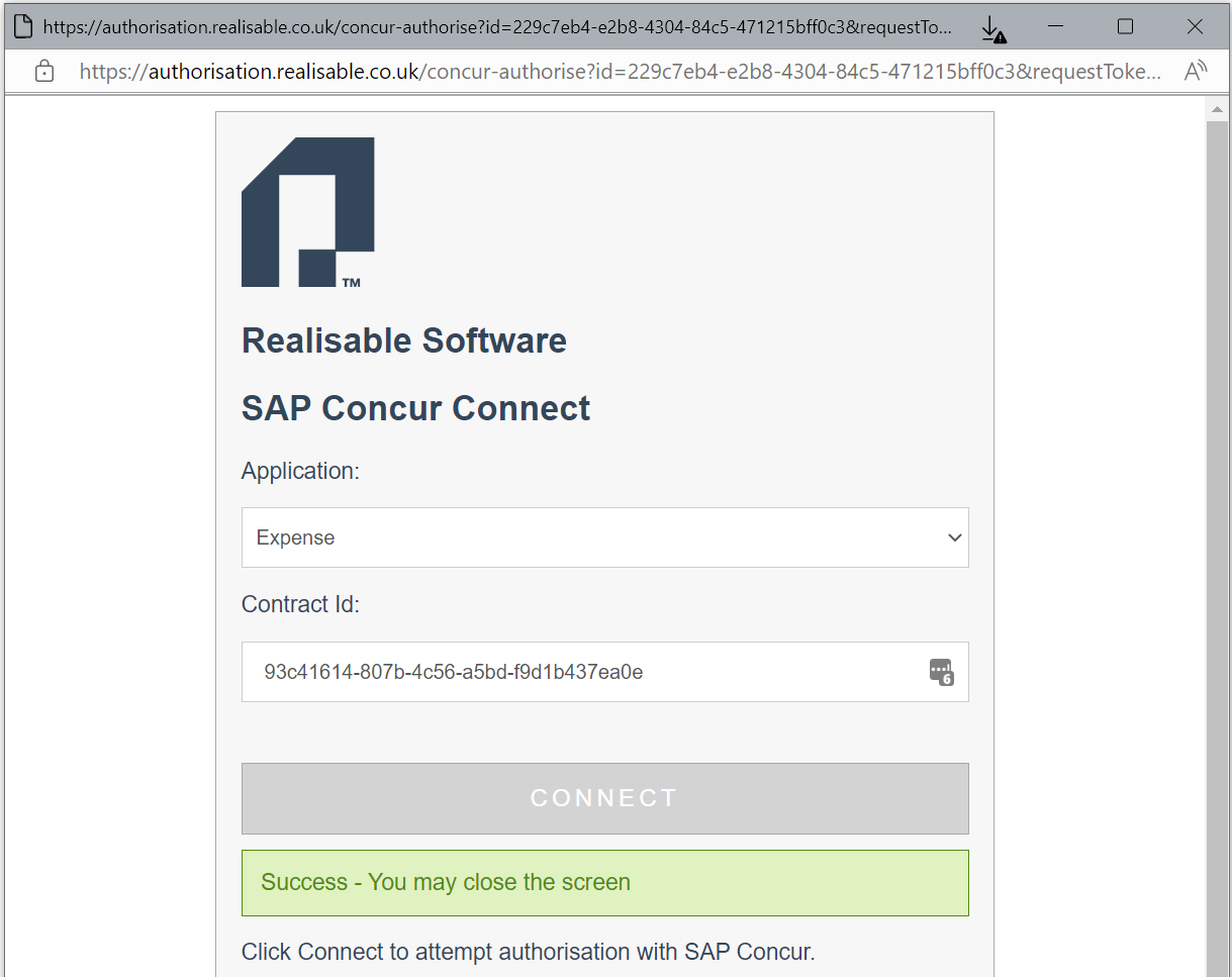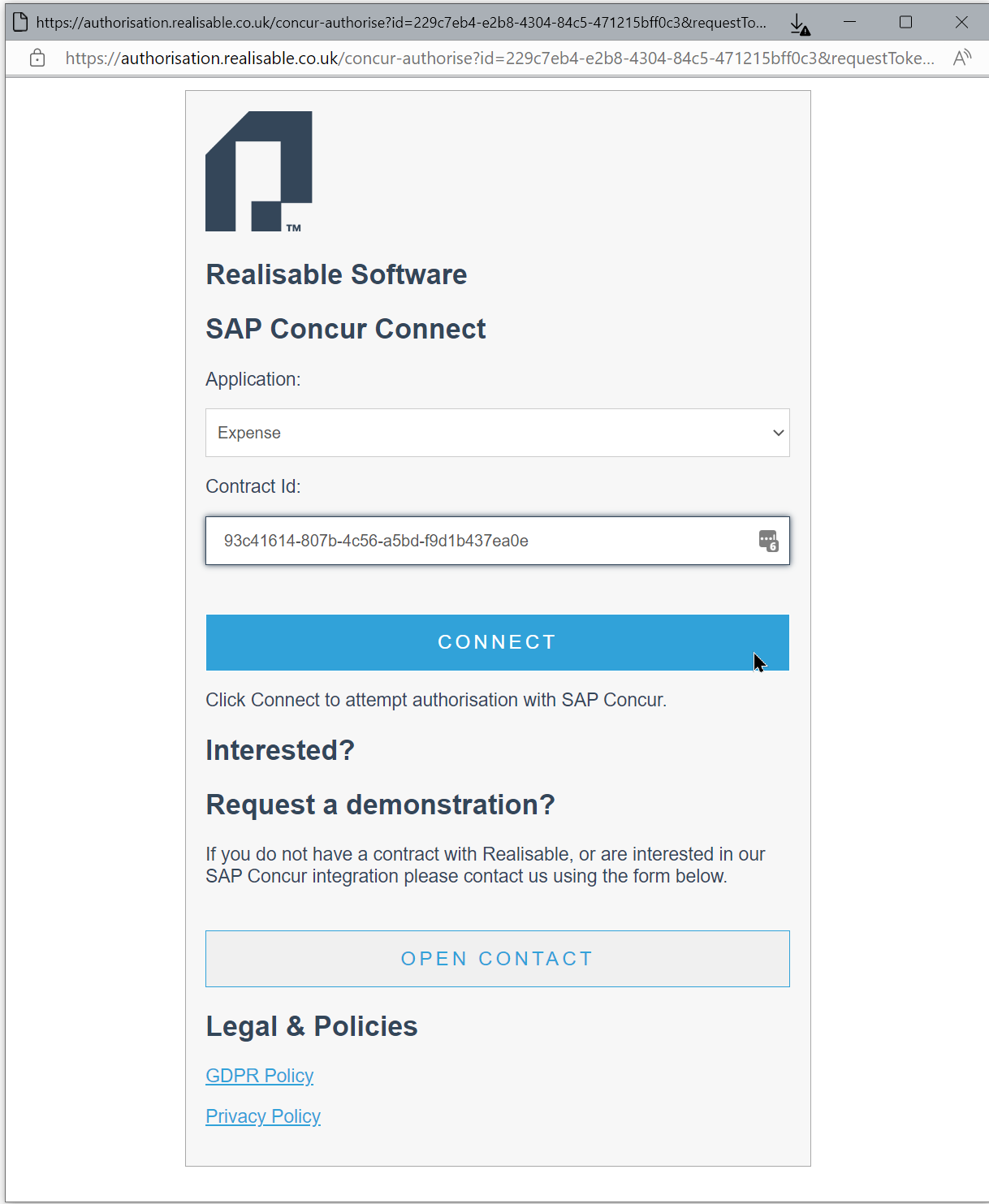 - A popup window will be displayed. On this screen you need to select either Expense or Invoice from the Application drop and enter the ID provided by Realisable into the Contract ID field.