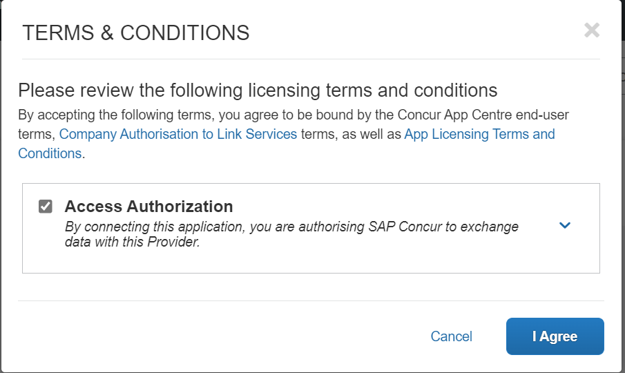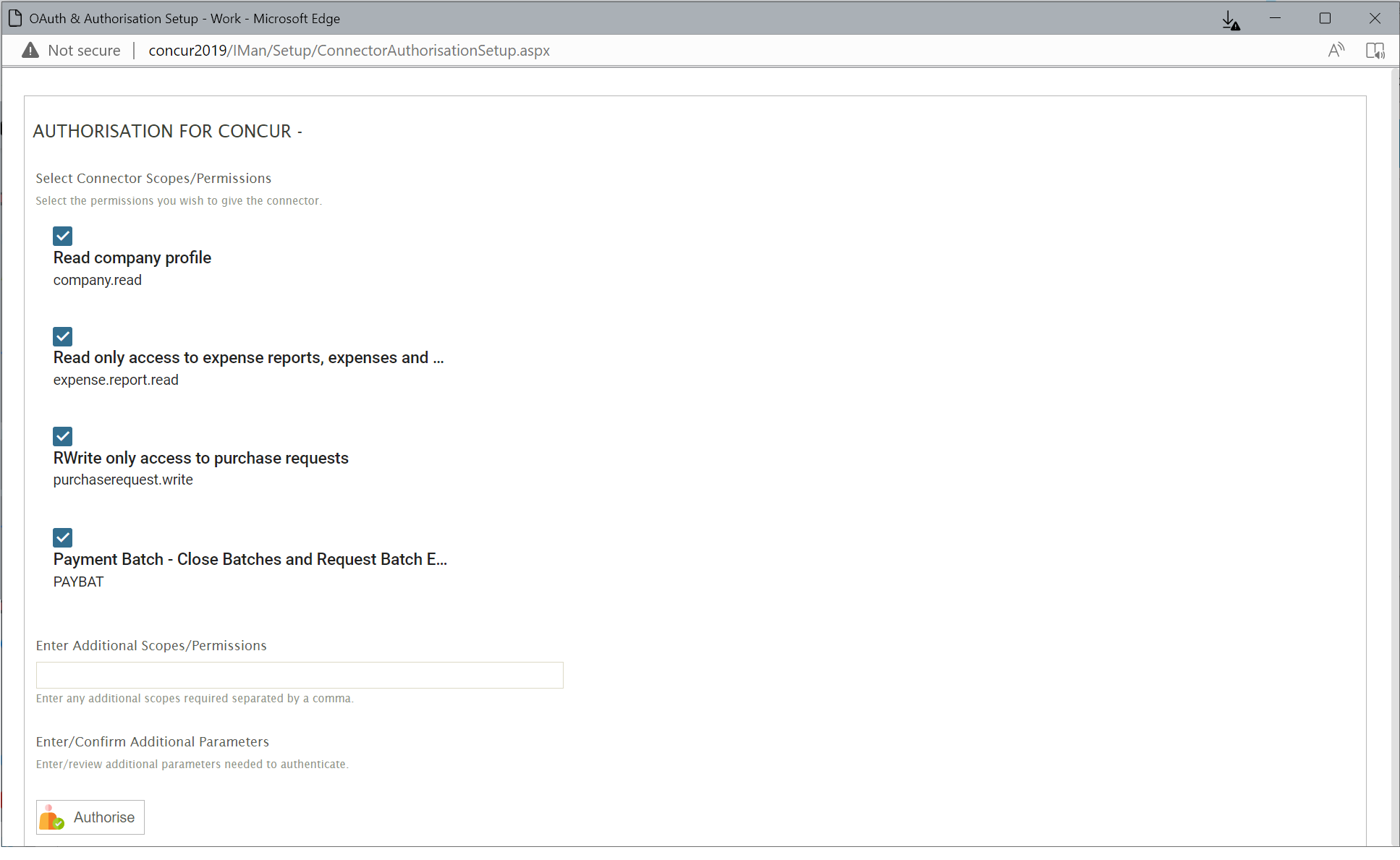 - Another window will open, prompting to confirm the permissions needed to integrate with Concur. Press the Authorise button.