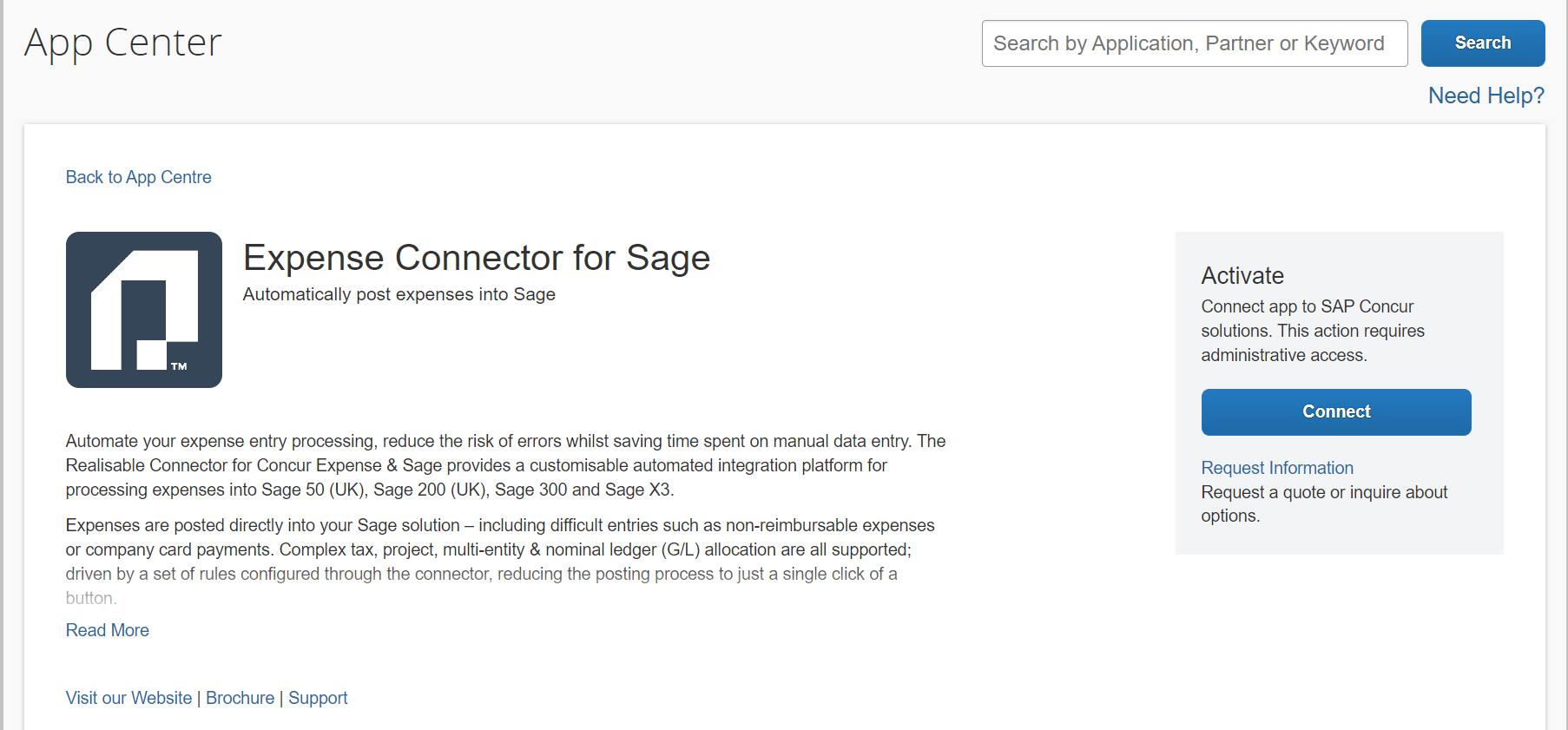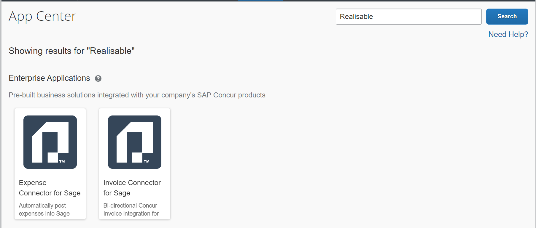 - Search for Realisable and click on either the Expense or Invoice connector, corresponding whether you are authenticating Concur Expense or Concur Invoicing.
