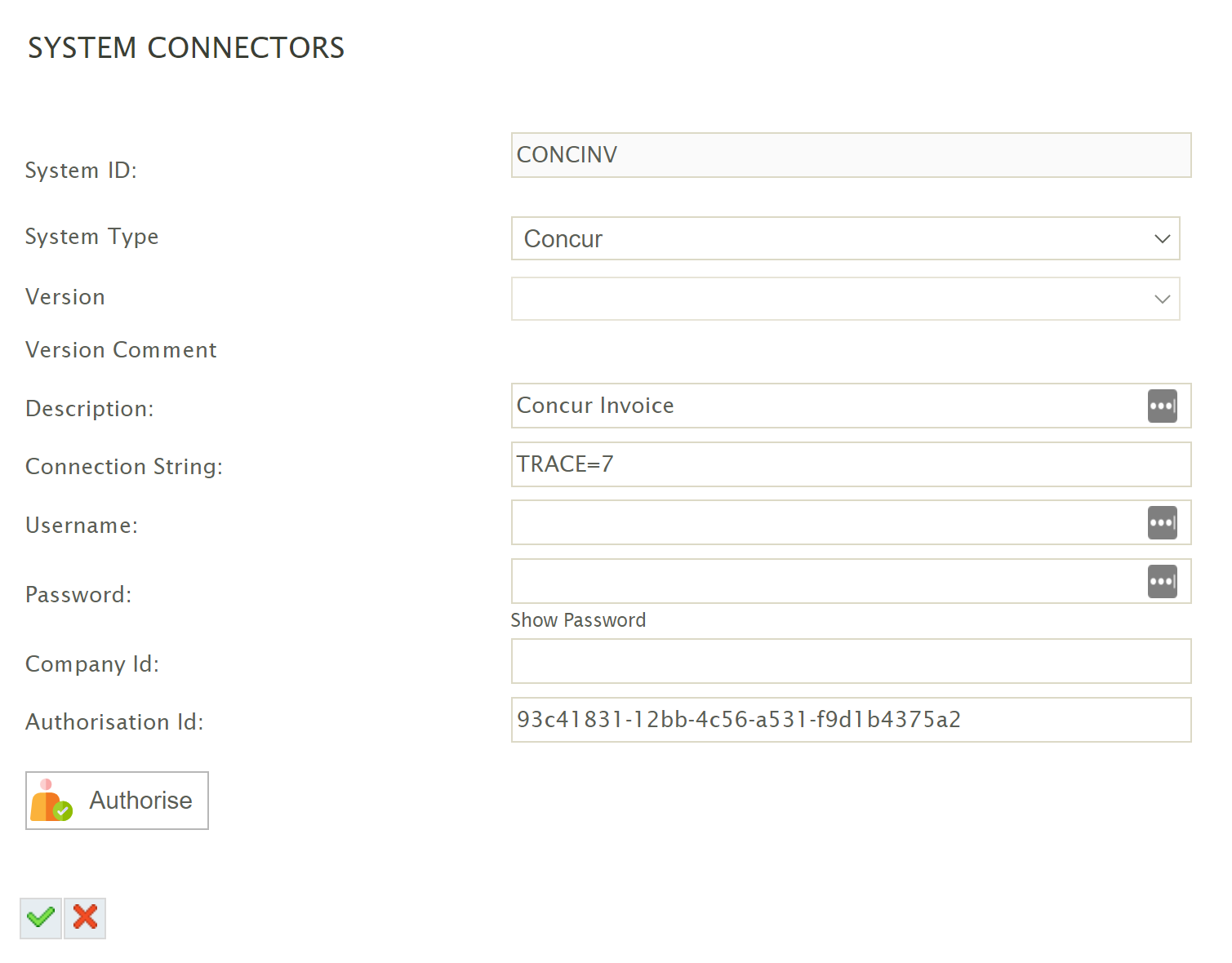 - Close the screen and press the Green tick on the System Connector page to save the entry.