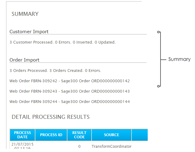 The primary purpose for the audit summary is to display the key data used to reconcile the information being passed from one system to another through the integration, e.g. order numbers, or customer Id's.
