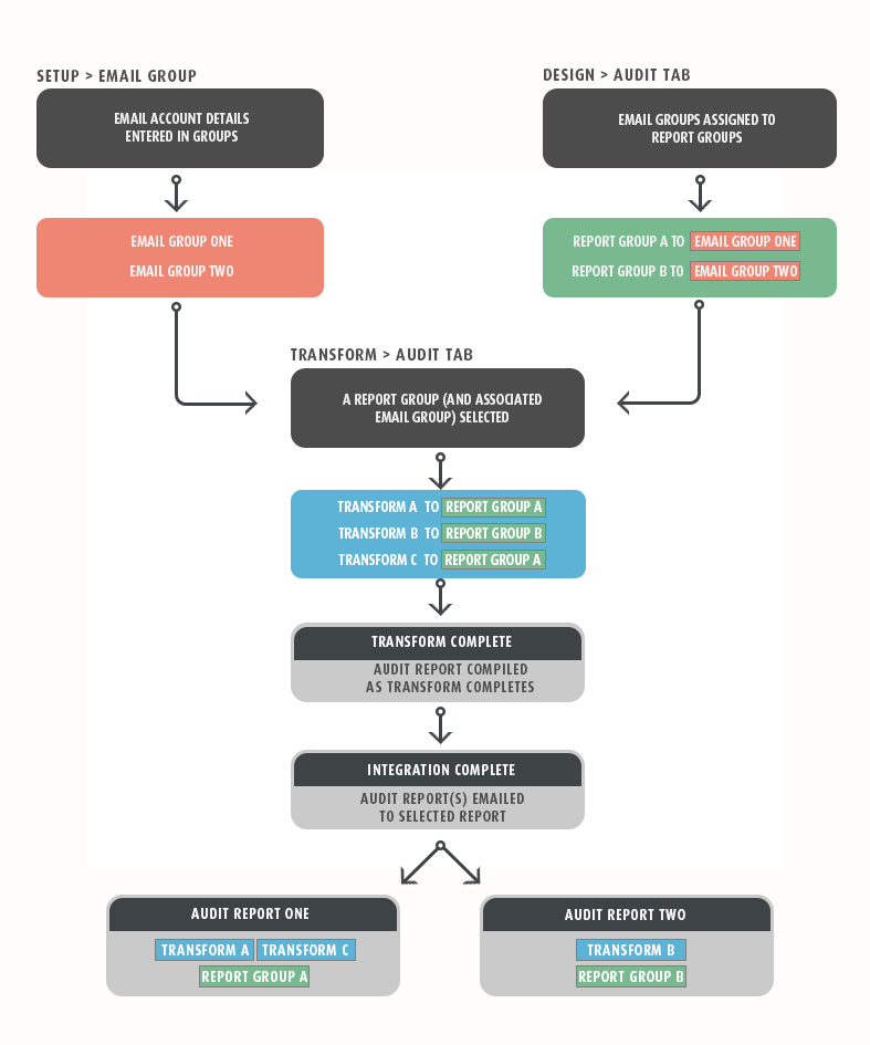 For example, an integration importing data from different parts of a company's accounting department can keep report groups for each part of the dataset and compile audit reports of relevant results to send to the recipients concerned with that data.