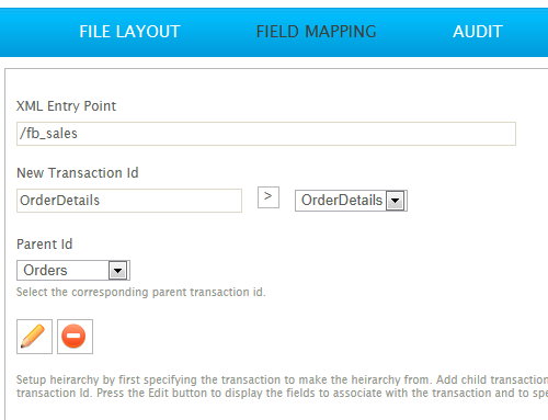 The first step is to define the Entry Point XPath expression. The Entry Point is where the topmost parent transaction type begins. In the example here, this is fb_sales. This is the starting position from where the transactions begin to recur.