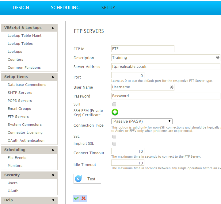 The FTP Server setup function is where FTP Server connections are defined. The FTP Connection supports standard, SSL, Implicit SSL and SSH (SFTP) connections.