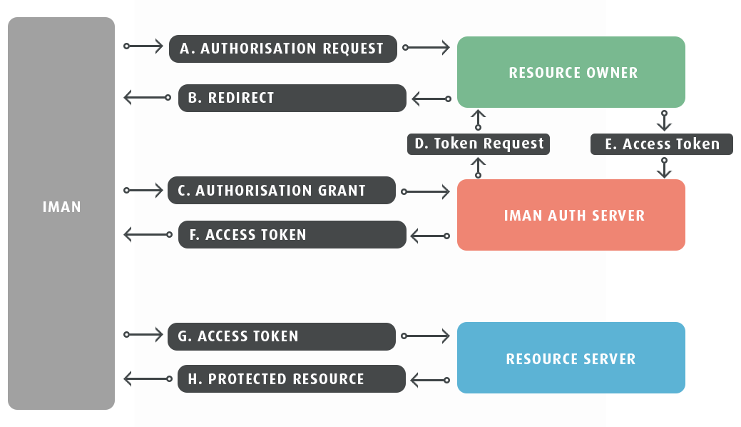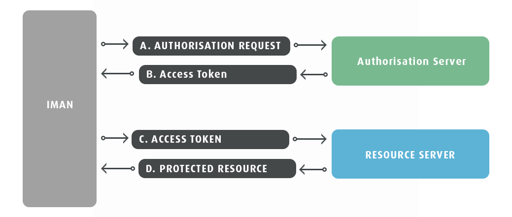 IMan will then use this access token in all requests to the web service (E) and the web service will respond (F).