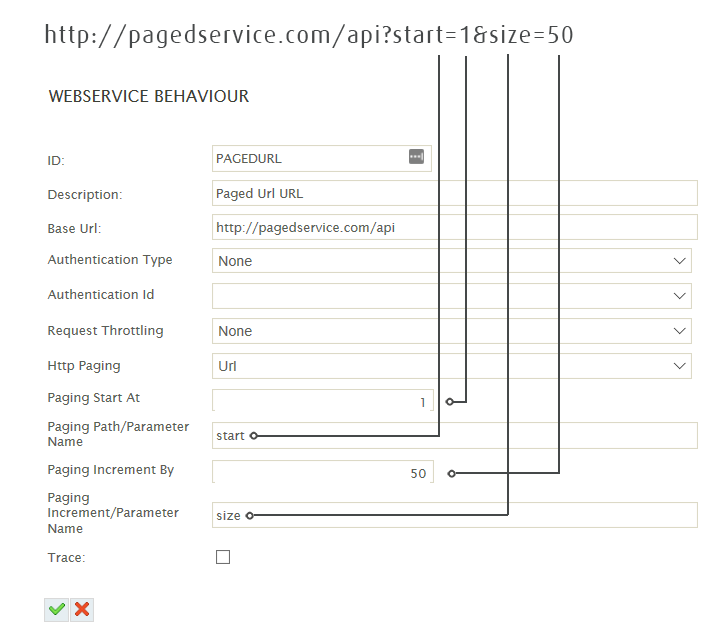 URL Paging has four properties to control its operation. This allows you to integrate with services which have implemented URL Paging differently.
