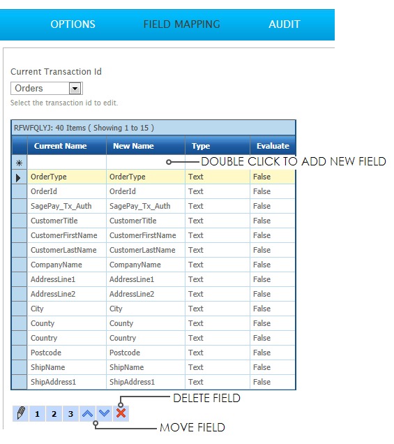 To control the sequence that fields are evaluated, move the fields up and down by using up and down arrow buttons at the bottom of the grid.