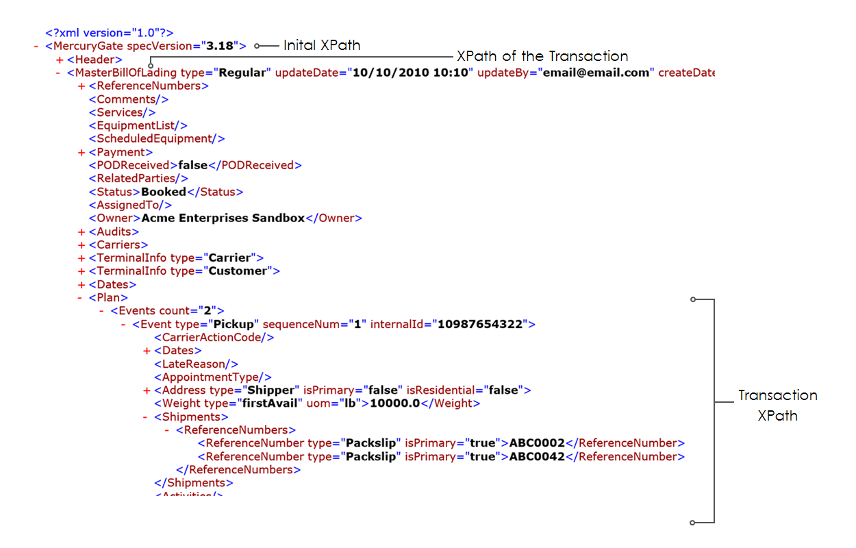 Assuming that we have a parent transaction type where the XPath of the Transaction is MasterBillOfLading and an initial XPath of MercuryGate. Both marked above.