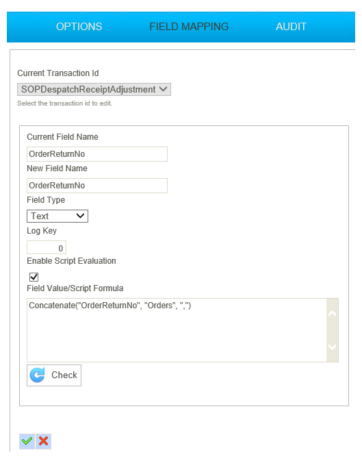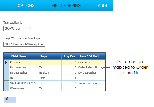 This step creates a despatch document from the Order.  To create a Despatch against the order the DocumentNo field is mapped to the Order Return No as shown below.