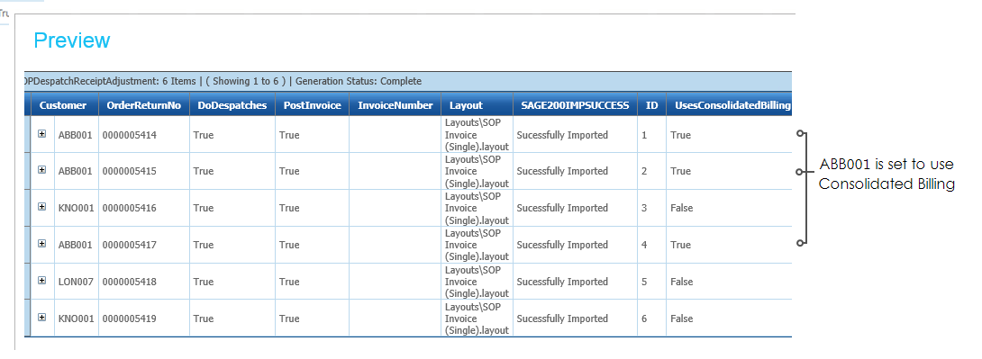 In the screenshot below the Customer ABB001 has been set to Use Consolidated Billing.