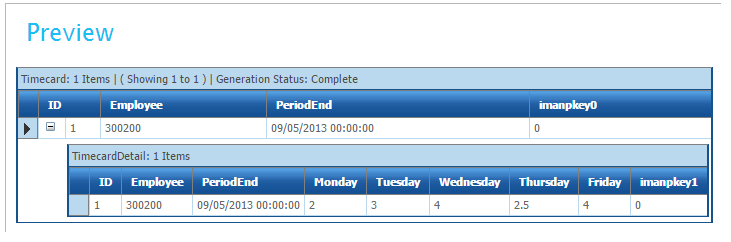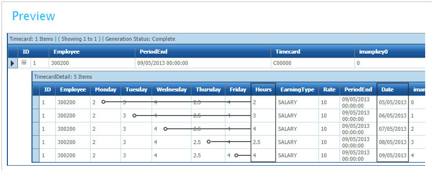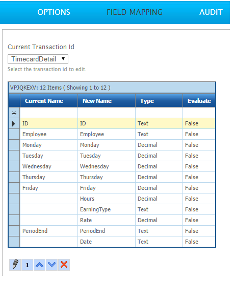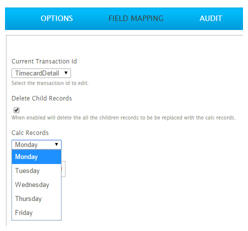 - Click on the Field Mapping tab & change the Current Transaction Id to TimecardDetail. Attached to the TimeCardDetail are five ‘Calc Records’, one for each day.