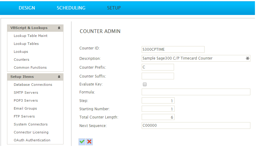 For each Timecard, this function generates a new sequential id, so the Counter function can be used to specify document numbers (as in this example below), customer numbers (for Sage300) and any other unique id.