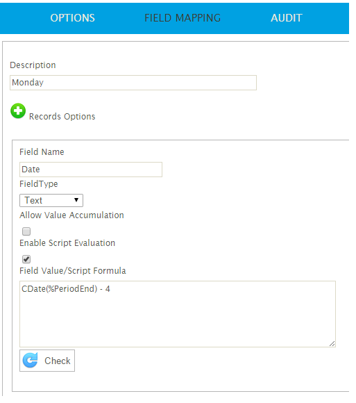 - The Hours field now references Tuesday and the Date field, instead of substracting 4 from the PeriodEnd field subtracts 3.