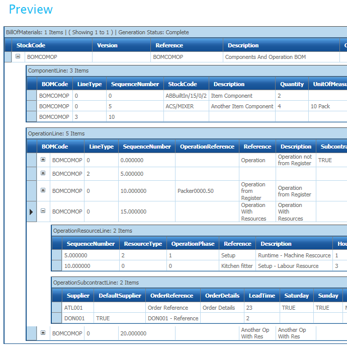 The BOM structure in Sage200 is quite complex. The BOM Imports supports this complexity, with the ability to create/update Components, Operations w/ Resources, Subcontractor & Components. To update the child levels the IMan dataset must be in a similar Master Item/Child structure as shown below.