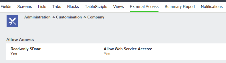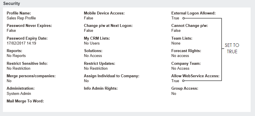 - Set the ‘External Logon Allowed’ and ‘Allow Web Service Access’ to true