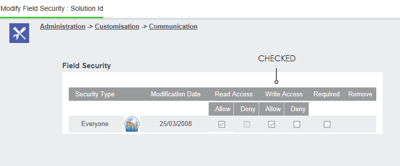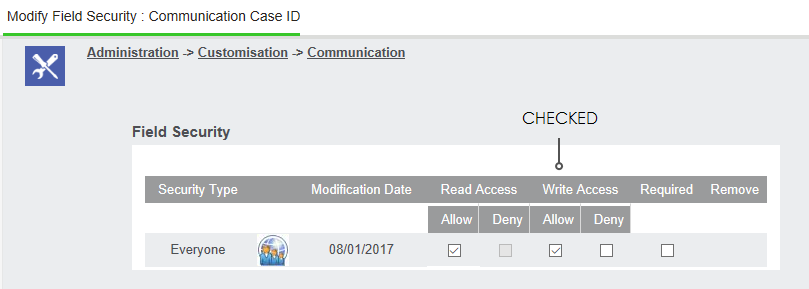 - Go Administration -> Customisation -> Communication -> comm_caseid Field Security.