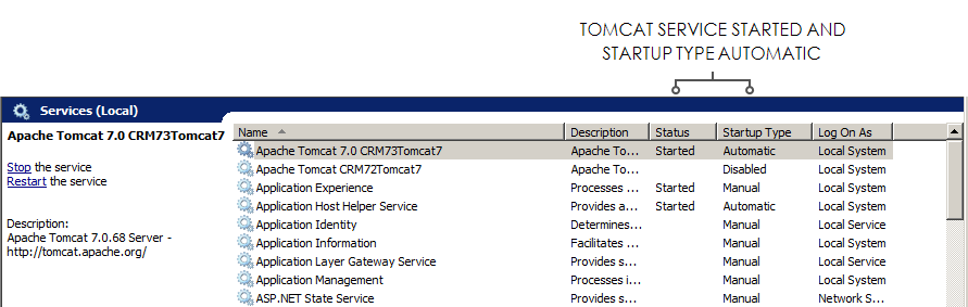 Ensure the CRM Tomcat service is started and the startup type is set to Automatic.