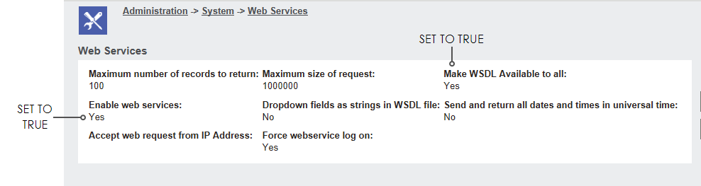 - Set ‘Make WSDL Available to all’ and ‘Enable WebServices’ to true