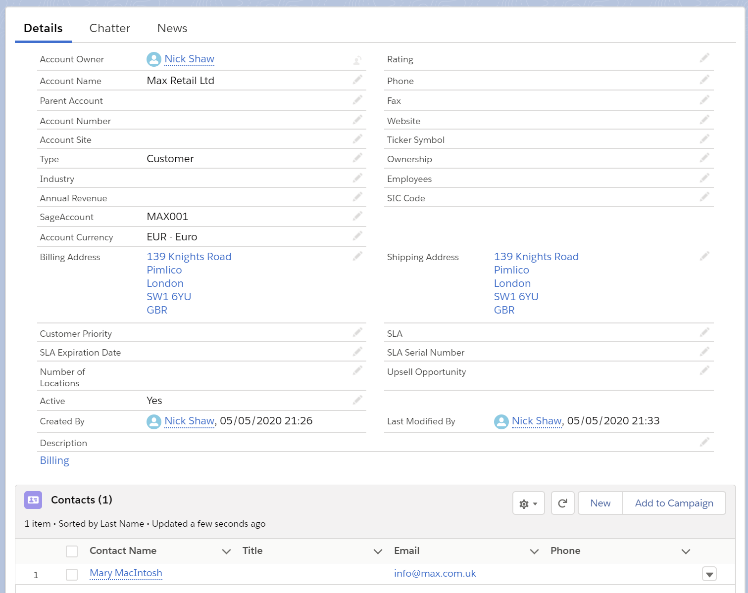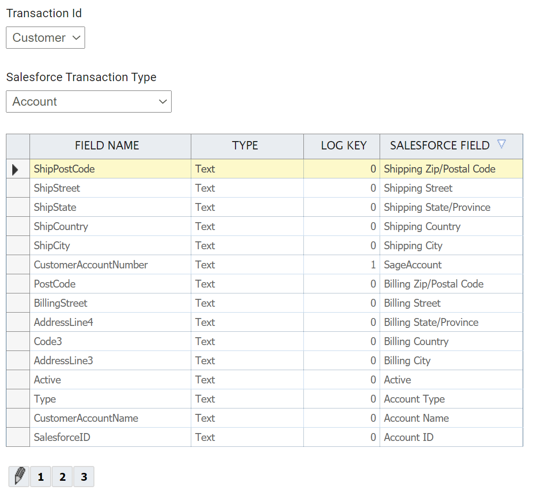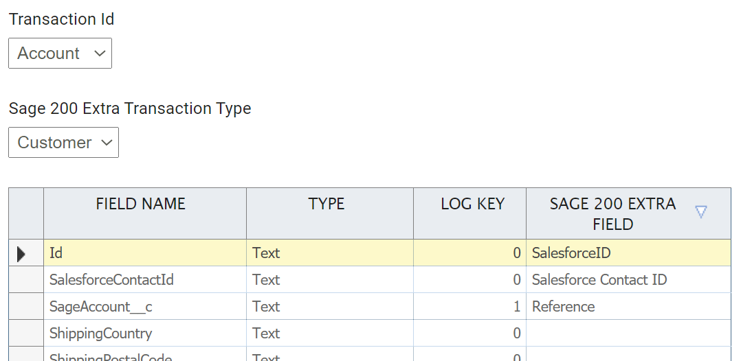 The integration requires two Analysis Codes on the Customer/Supplier record. The Analysis Codes are used to store the Salesforce Ids for the record in Sage and passed to Salesforce to specify the record to update.
