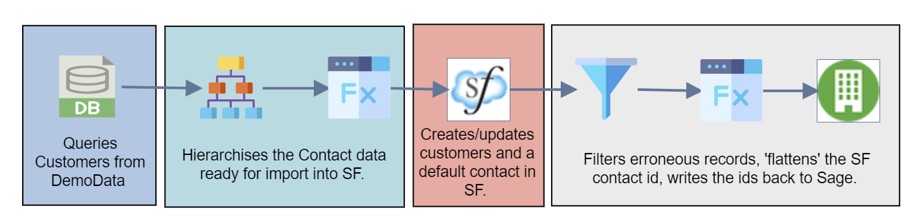 - Filter erroneous records; flattens the Id from the Salesforce Contact record into the header so that it can be written to Sage; write both the Customer/Supplier Id and default contact Id to Sage.