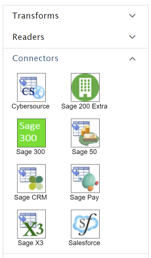 The Salesforce Connector is found in the Connectors group of the design palette on the left hand side of the Transform Setup tab.