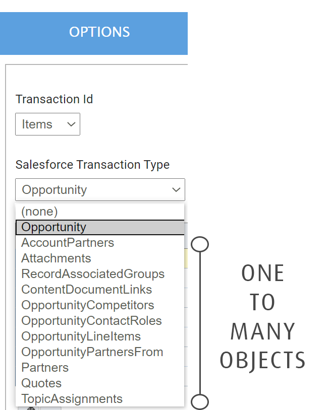The selected item represents the top-most object to be inserted/updated. For example, to create Opportunities with Line Items, select Opportunities from this list, as the Line Items are a child.