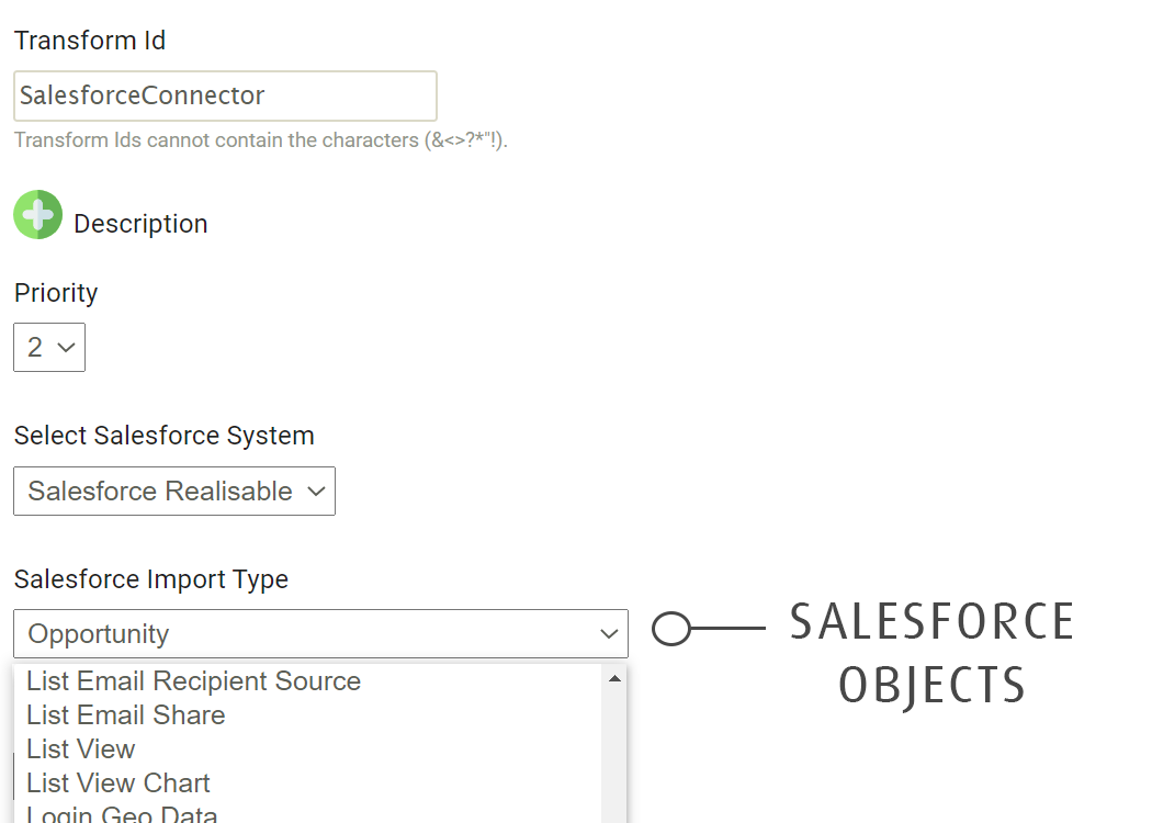 Select the Salesforce System you wish to integrate with from the drop down. Once selected the Entity drop down will be populated with all the Objects in Salesforce which the user associated with the Salesforce system has permission to.
