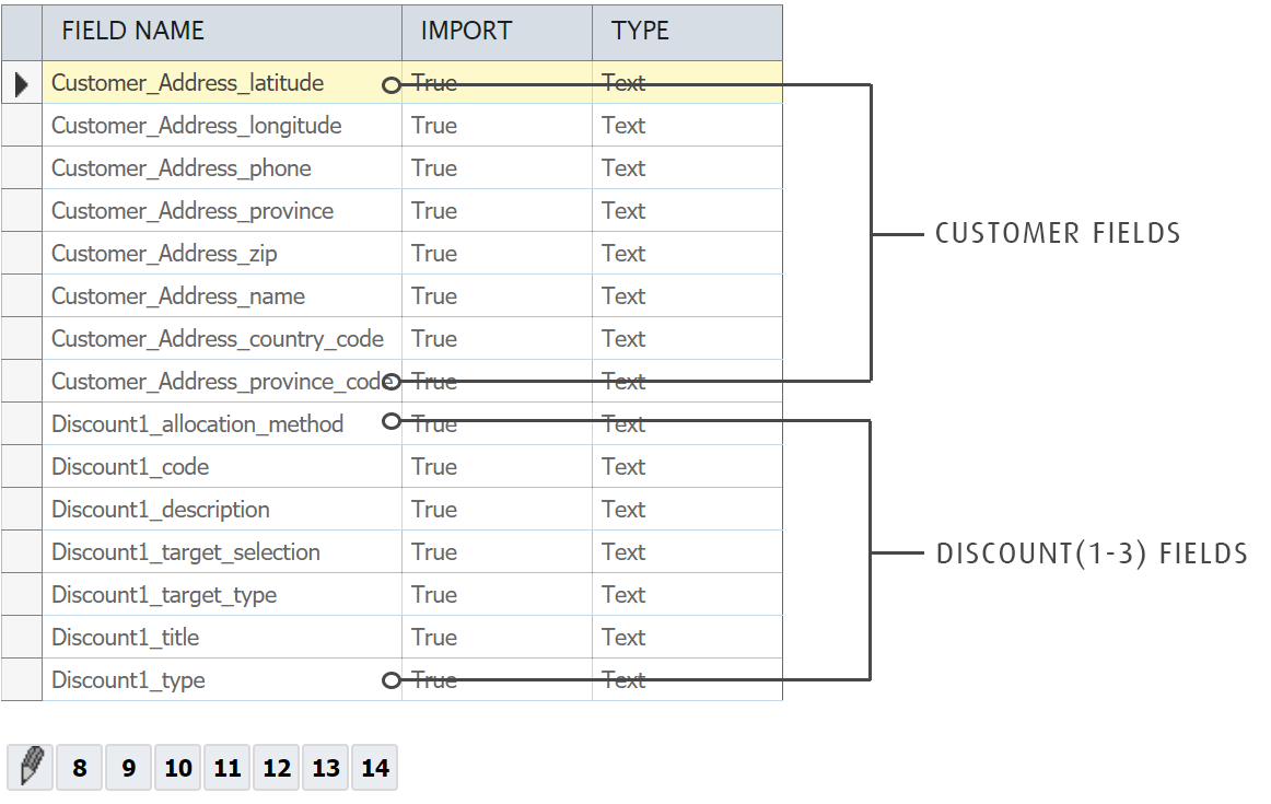 For each of the flattened sets of fields we return the first X number of child records. For example, for discounts we return the first 5 discounts applied to an order. We assumed that no more than 5 discounts would ever be applied to an order.