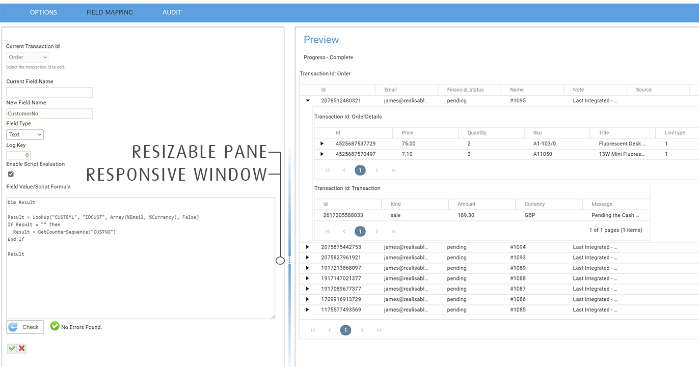 Most of the screens also respond to the pane re-size so elements on the left hand (options, field mapping grids, auditing setup) will shrink and grow accordingly.