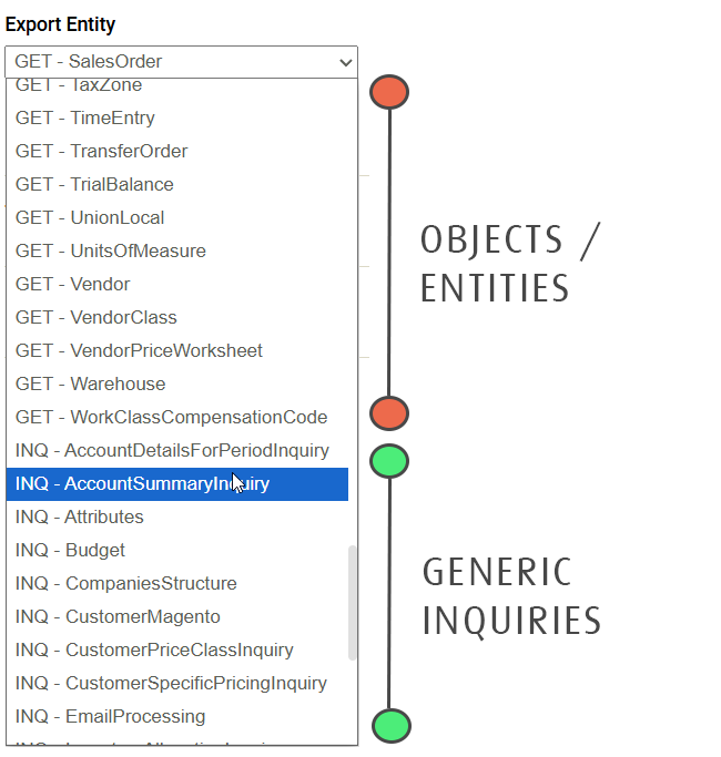 All objects and generic inquiries exposed to the webservice endpoint are listed. Objects are prefixed with GET and Generic Inquiries with INQ