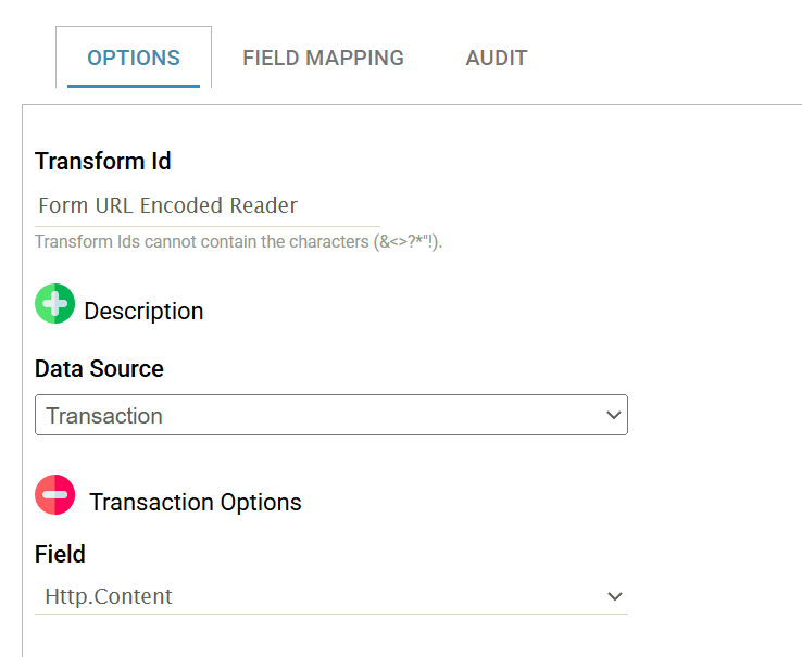 The Form URL Reader can consume data from either a file or a designated field using Transaction.