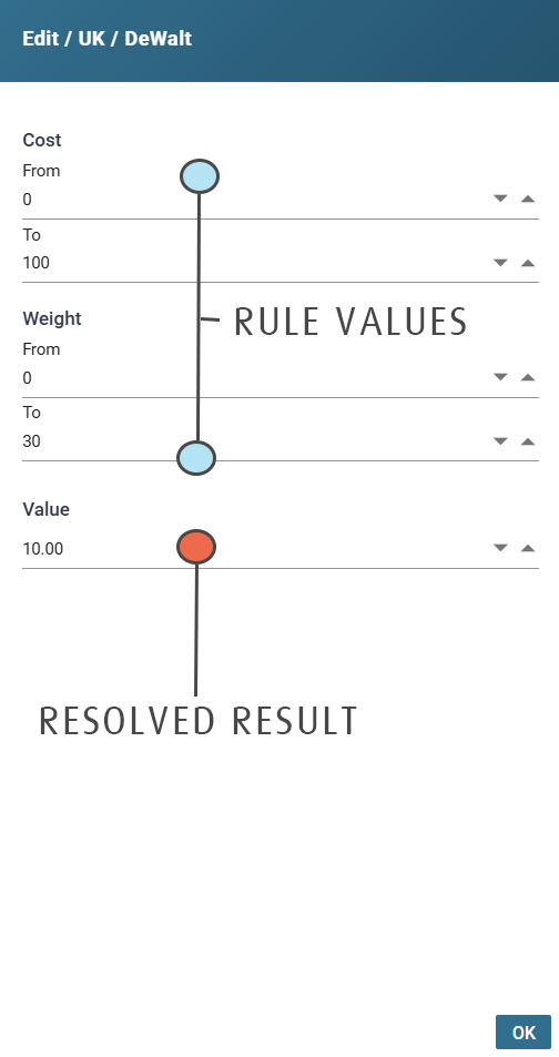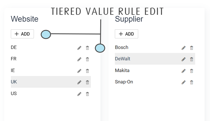 - Rules defined as a tiered lists have their 'items' displayed in a selectable column of values.