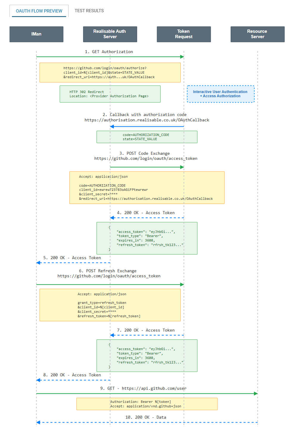 Displays a live sequence diagram that visualises the configured OAuth flow. The diagram updates automatically as you change settings, showing:
