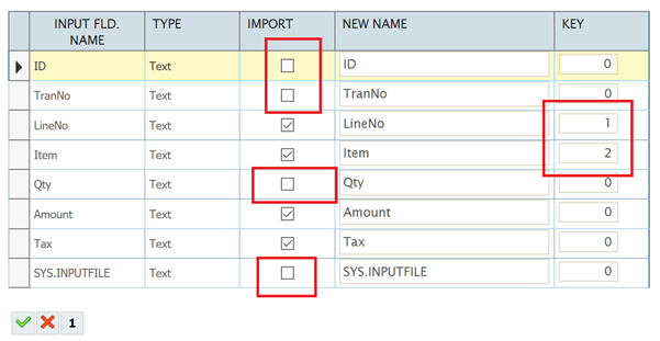 - Deselect the ID, TranNo, Qty, and SYS.INPUTFILE fields; set the Keys to LineNo and Item.