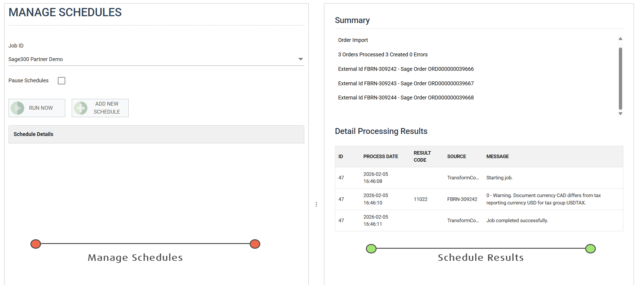 On the right hand side of the schedule screen is the integration results area. For the Job selected, any integrations which are run will display the audit results.