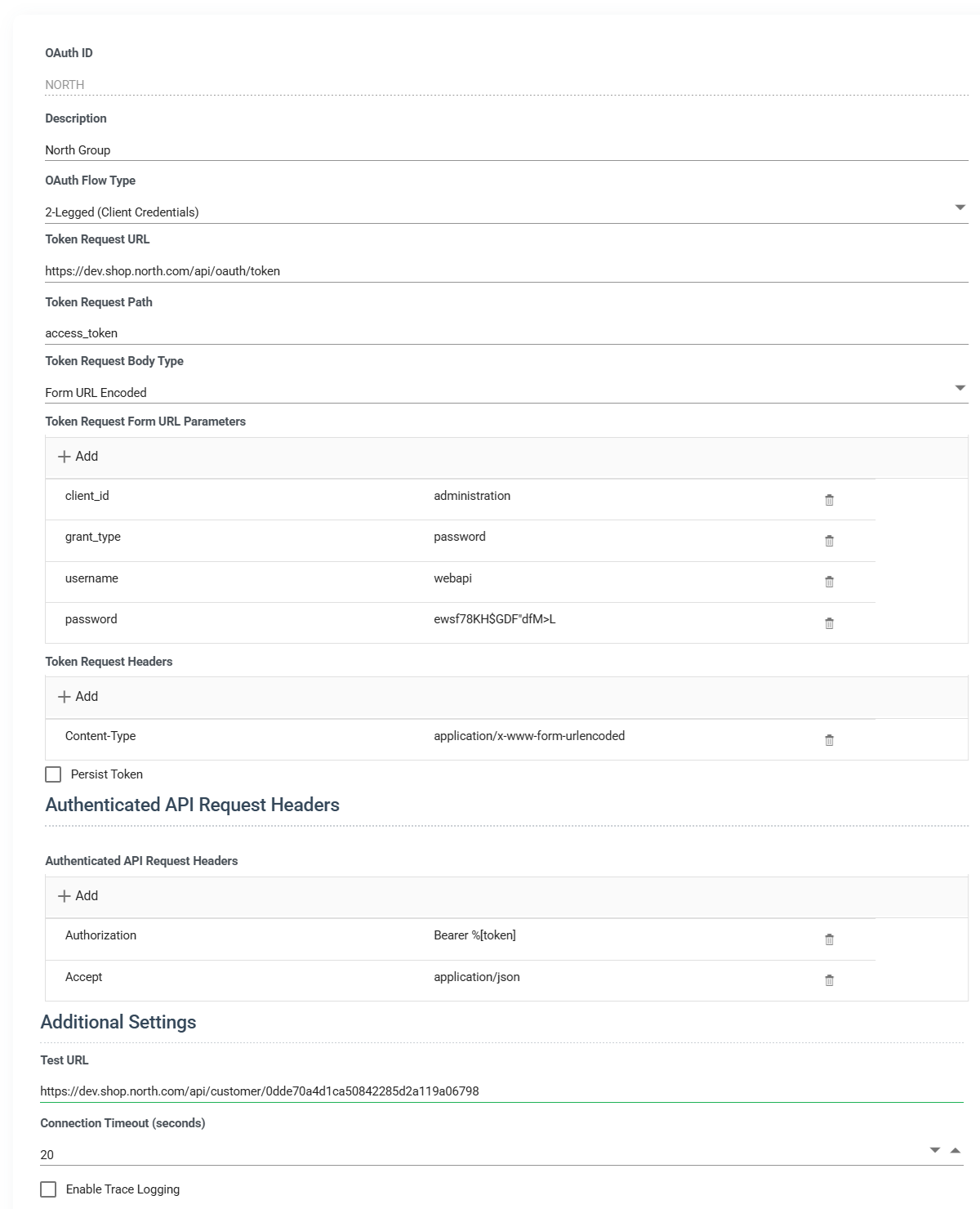 Clicking the test button will execute the OAuth connection and attempt to make a GET request to the Test Url with the returned access token. The test results show :